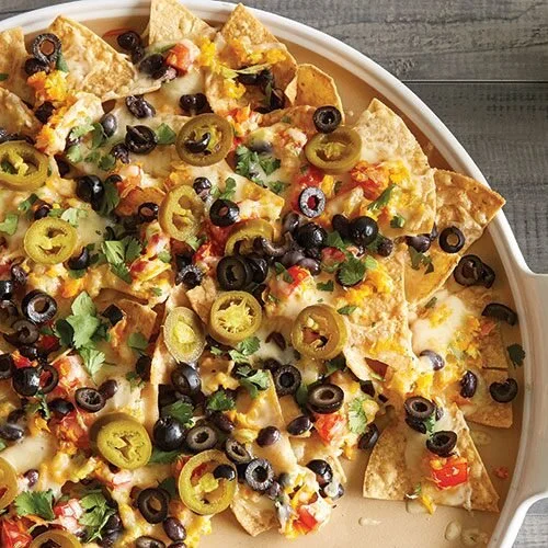 Preheat the oven to 425°F (220°C). Arrange the tortilla chips in a slightly overlapping layer on the White Large Round Stone.