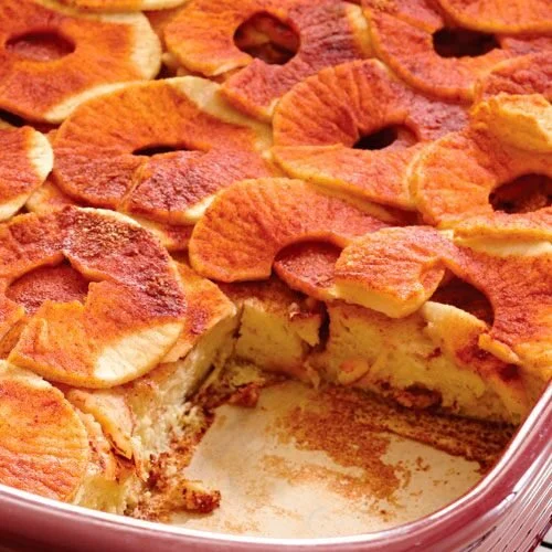 In Classic Batter Bowl, beat eggs with Stainless Whisk. Whisk in milk, 3 tablespoons of sugar, vanilla, and salt. Pour over bread. Combine the remaining 5 tablespoons of sugar and cinnamon in a Flour/Sugar Shaker. Peel, core, and slice apples using Apple Peeler/Corer/Slicer. Cut into rings by slicing down one side of each apple with Petite Paring Knife. Place half of the apples over the bread. Sprinkle half of the sugar-cinnamon mixture evenly over apples. Repeat layers. Cover and refrigerate for 1 hour or overnight.