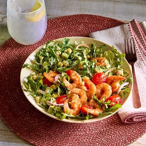 In a large bowl combine the corn, arugula, avocado, and red onion. Drizzle with the dressing and toss to coat. Top the salad with roasted tomatoes and shrimp.