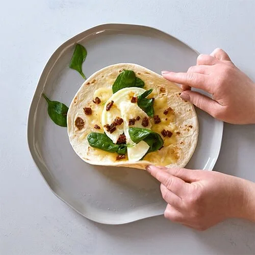 Add the tortilla to the shallow insert and microwave for 30 more seconds. Remove from the microwave and assemble with the cheese.