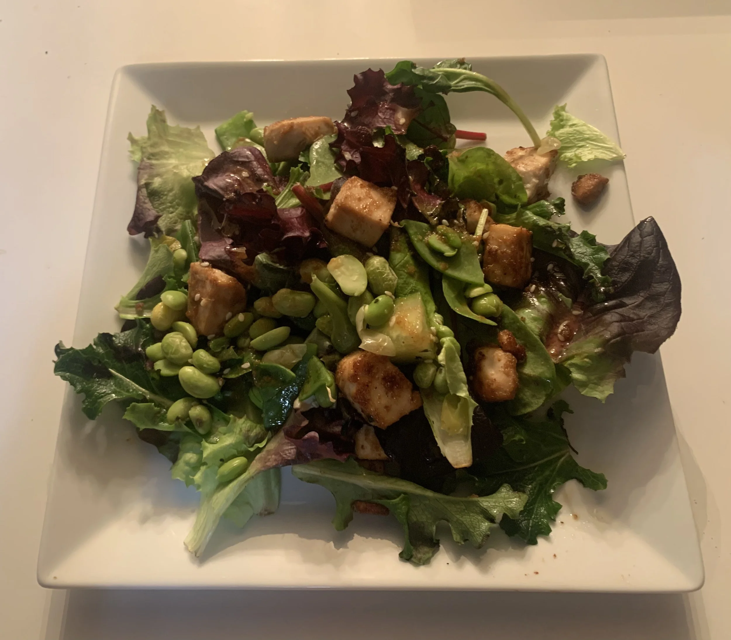 April - Spring Salad with Edamame, Cucumbers. Snow Peas and Tofu Croutons